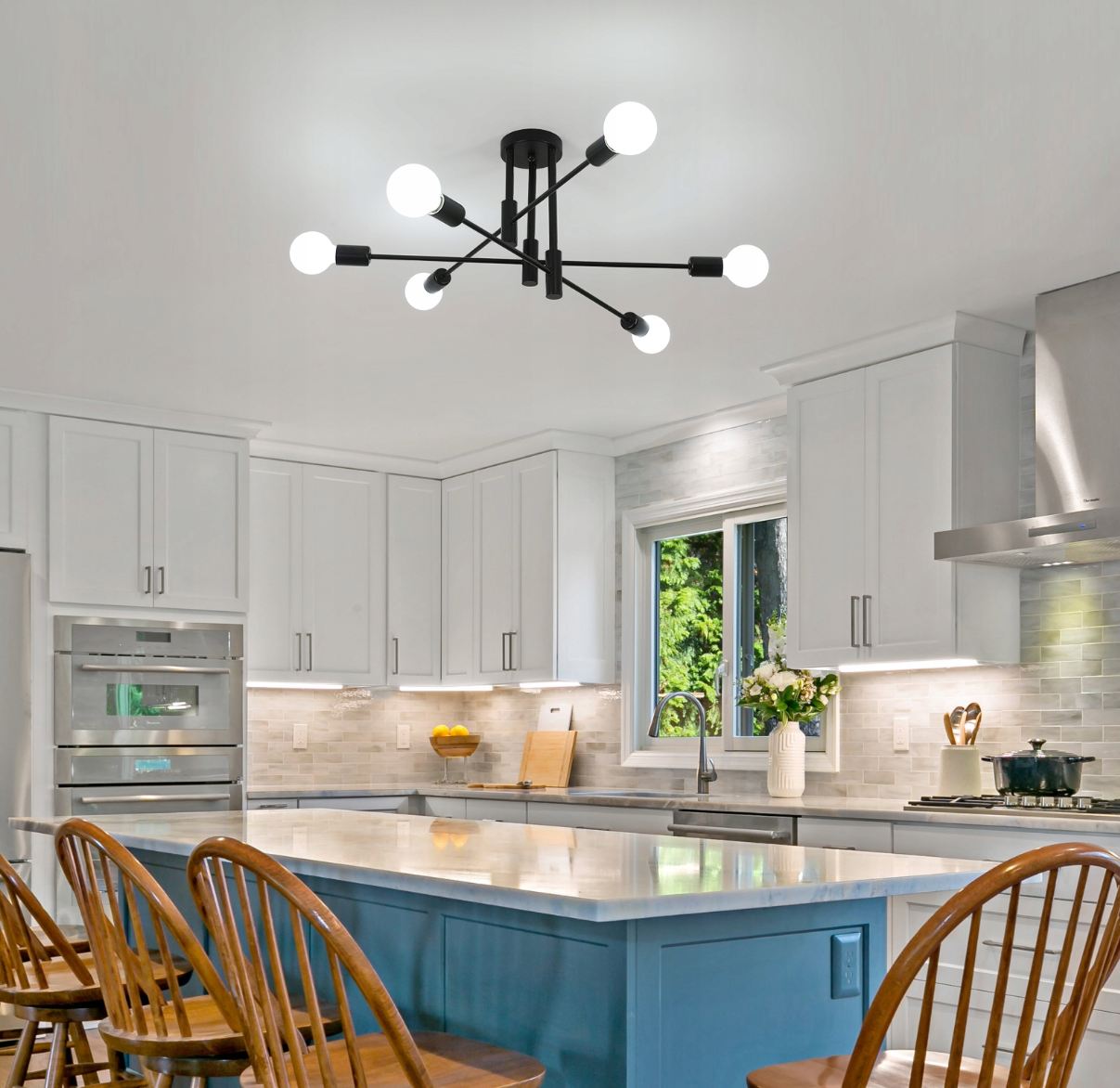 Strop s osvetľovacími telesami pozostáva zo 6 dlhých a krátkych prekrížených lineárnych ramien a pojme 6 žiaroviek, čo v kombinácii s industriálnym štýlom a otvoreným dizajnom poskytuje dostatok svetla na ľahké čítanie knihy alebo zobrazenie všetkých miest, ktoré potrebujete upratať. Zároveň je estetický a dodáva vášmu miestu štýl, aj keď je svetlo vypnuté. Moderný luster môže slúžiť dlhú dobu. Ušetrite si problémy s častou výmenou.
