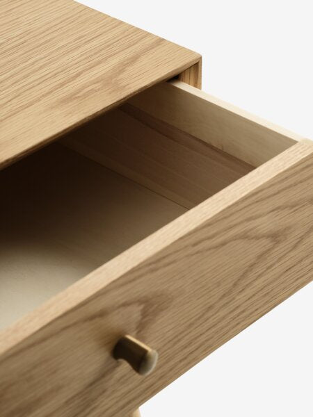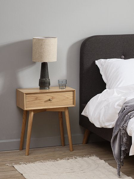 Nočný stolík HOKKSUND v prírodnom dube je teplá a elegantná voľba pre vašu spálňu.
