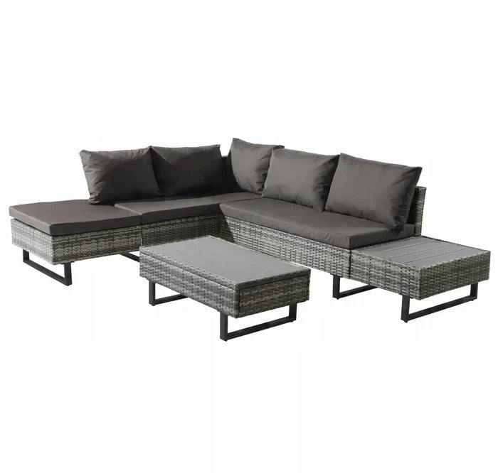 Elegantná kombinácia gradientového šedého ratanu, tmavošedých vankúšov, čiernych nožičiek a panelov vo farbe dreva vytvára modernú, útulnú atmosféru. Dokonale ladí s rôznymi vonkajšími aranžmánmi – od moderných terás až po klasické záhrady.