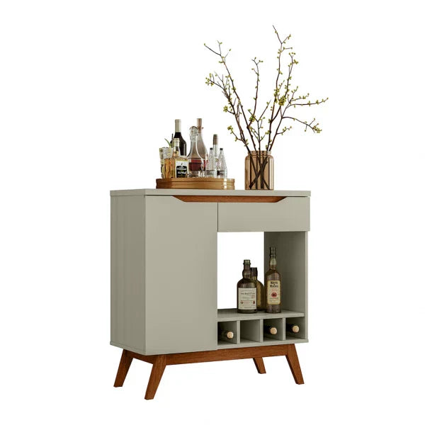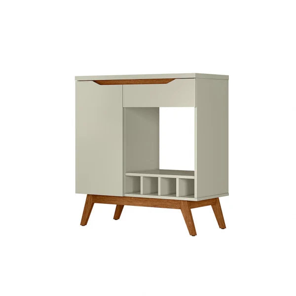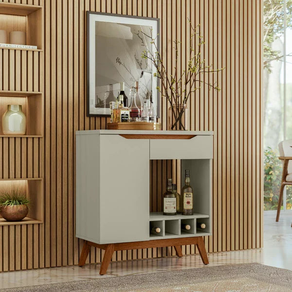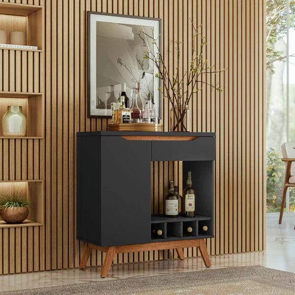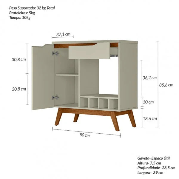 Retro skriňa Tokyo s vinotékou má dosku hrúbky 25 mm. Dvere a zásuvka majú opracovanie, ktoré slúži ako úchytky, pánty a výsuvy sú kovové. Obsahuje aj vinotéku na 4 fľaše vína a ďalší otvorený priestor na uloženie predmetov pre váš malý bar. Nohy sú lakované v štýle rámu, ide o skvelý produkt, ktorý môžete použiť ako príborník a zároveň ako bufet s vinotékou.