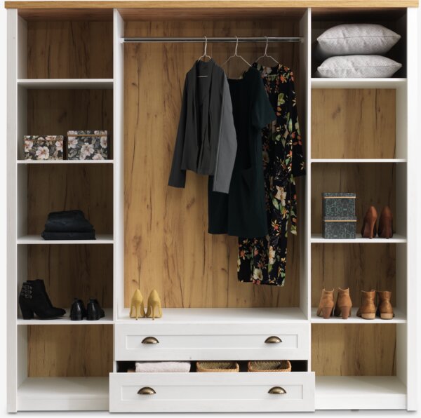 Skriňa MARKSKEL 212×210 v bielej farbe s detailmi vo farbe duba.