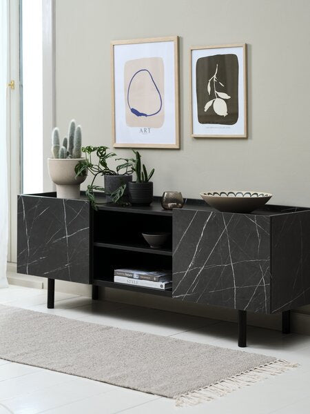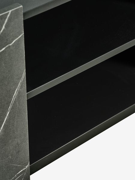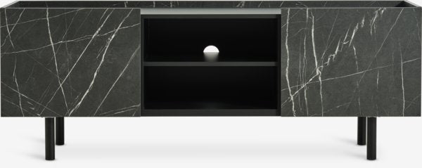 TV skrinka KRONDAL s dvomi dvierkami v kombinácii mramoru a čiernej farby – spája moderný elegantný vzhľad s minimalistickou estetikou.