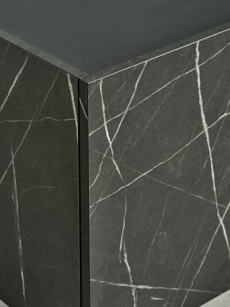 Mramorový dekor na vrchnej doske a dvierkach dodáva sofistikovanosť, čierna farba rámu zas eleganciu a vizuálny kontrast.